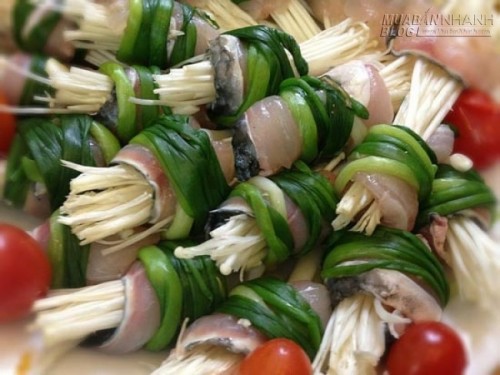 - Cá quả làm sạch,lọc xương ướp với 1 chút gừng đã được băm nhỏ, cuốn cá với một ít nấm kim châm sao cho đẹp mắt.