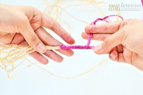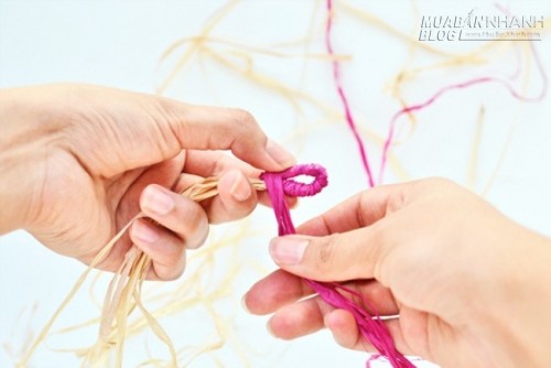 Bước 2: Giữ chặt bó dây bằng ngón tay cái rồi lấy những sợi cọ màu hồng bắt đầu quấn quanh sợi cọ màu kem. Ở đoạn đầu tiên, bạn cần có điểm thắt đầu dây để nó bị không bị rơi ra
