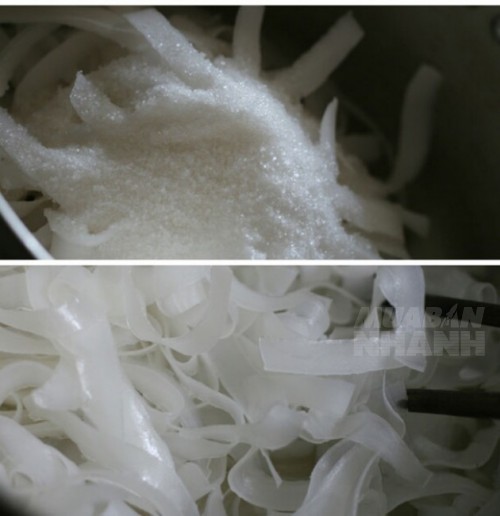 - Khi sợi dừa đã ráo nước, bạn để sợi dừa ra một chiếc chậu vừa phải, tiến hành ướp dừa với 250g đường kính trắng.