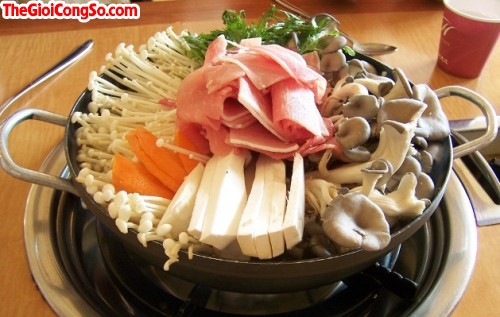 - 100g nấm kim châm; 100g nấm đông cô; 100g tôm tươi; 100g tàu hũ tươi (váng đậu); 100g chả xoắn của Nhật; 100g bắp non