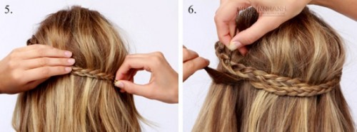Bước 3: Sau khi đã đánh rối tóc ở trên, bạn vòng 2 bím tóc thắt chéo nhau ra đằng sau và dùng kẹp tăm cố định, kéo phần tóc ở đỉnh đầu cho cao lên chút. Kiểu tóc vương miện điệu đà này không quá khó để làm đúng không. Với những ngày đi làm công sở bình thường bạn có thể tạo kiểu tóc này. Mặc một chiếc váy hoa họa tiết kết hợp với áo vest thanh lịch, bạn đã có ngay vẻ ngoài trang nhã rồi đấy.
