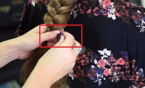 Bước 3: Lấy một phần nhỏ của tóc từ bên phải đầu, dùng ngón tay cái và ngón trỏ trái để tách vòng đầu tiên của bím tóc ở bên trái, sau đó kéo phần tóc ở bên phải qua.