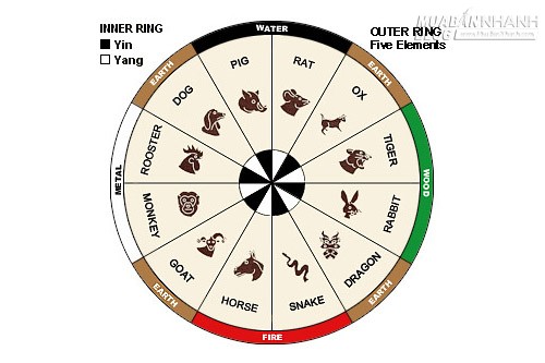 | Bảng âm dương/ngũ hành trong 12 con giáp. |