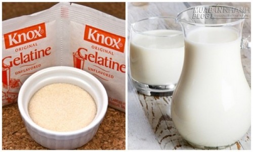 - Trộn đều gelatin với sữa tươi vào 1 cái cốc, rồi cho vào lò vi sóng chừng 10 – 15 phút giây, để được hỗn hợp kem đặc.