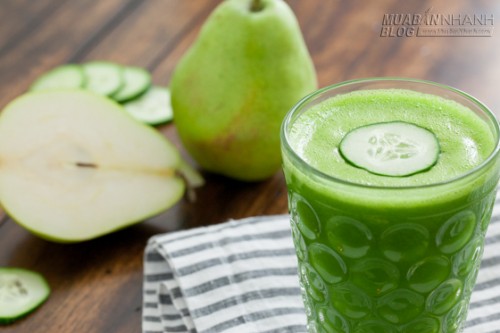Lê, dưa leo, rau bina rửa sạch. Lê và dưa leo gọt vỏ cắt khúc, rau bina cắt nhỏ, chanh vắt lấy nước. Cho toàn bộ chúng trong máy xay sinh tố, xay nhuyễn và mịn.