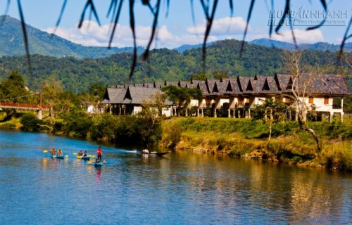 Dừng chân ở Vang Vieng, du khách có thể nghỉ ngơi trong những căn lều cỏ dựng ngay trên mặt nước, thong dong thả mình trên những chiếc phao để tận hưởng không khí trong lành, hoặc chèo kayak thư giãn và ngắm cảnh trời mây sông nước… Ảnh: EvE