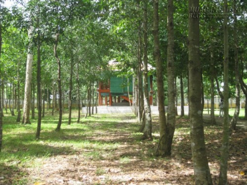 Nhà sàn Bác Hồ tại Trà Vinh, bao quanh là vườn cây xanh bát ngát.