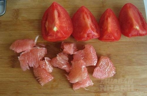 - Hoàn thành các công đoạn xong, bạn tách 3 – 5 múi bưởi lấy phần tép đem xay nhuyễn với cà chua thái nhỏ trong khoảng 2 phút.