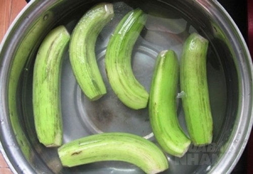 - Chuối xanh mua về gọt vỏ rồi ngâm với chậu nước muối loãng để loại bỏ nhựa và bụi bẩn.