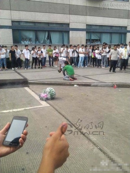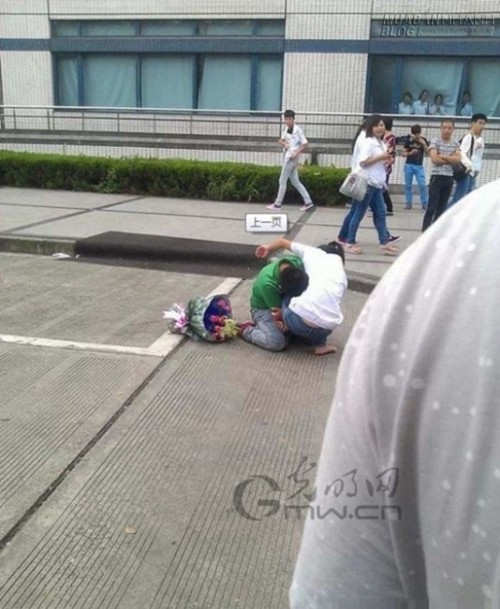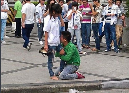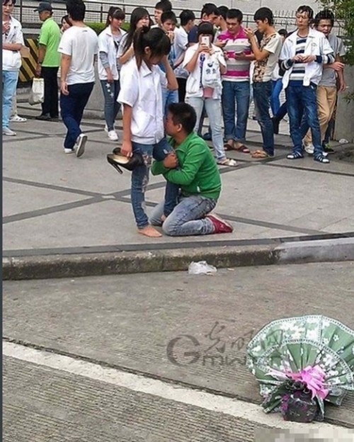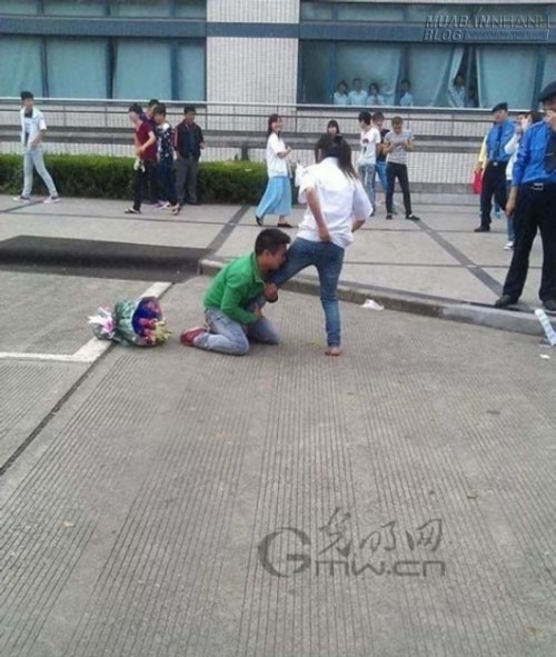 Bức ảnh được chụp ở cổng ra vào một công ty ở Thượng Hải, Trung Quốc. Giữa thanh thiên bạch nhật, bất chấp người đi đường vây quanh, anh chàng này không ngần ngại quỳ xuống ôm chân bạn gái mà khóc lóc thảm thiết.
