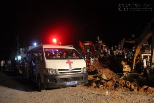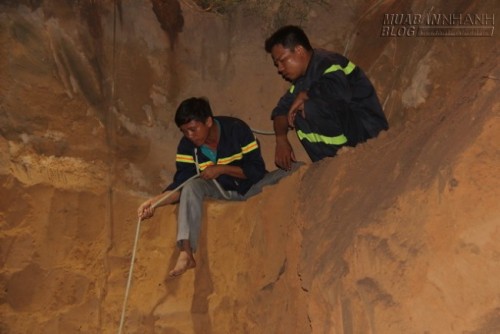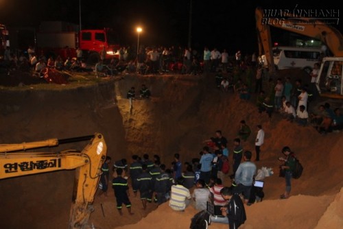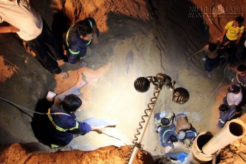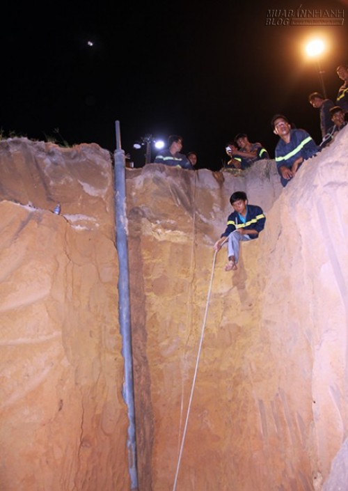 Đây là khu vực đất vàng pha cát. Mỗi giờ, lực lượng cứu hộ chỉ đào khoảng một mét. Đến 22h, một tổ đào giếng chuyên nghiệp được điều động đến thay phiên nhau đào một đường bên cạnh song song để giải cứu cháu bé.