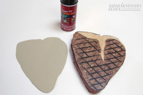 - Giờ thì bạn dán hình miếng bò bít tết mẫu và tấm bìa cứng vào hai mặt của tấm mút xốp nhé!