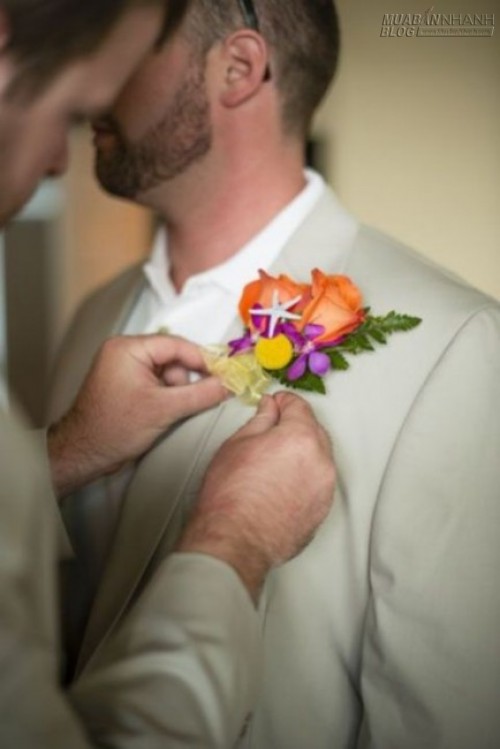 Phối thêm một con sao biển sẽ khiến hoa cài áo của chú rể thêm phần tinh tế và “ton sur ton” với bó hoa của cô dâu.
